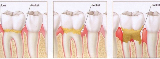 Parodontita: Dacă nu este îndepartată, placa microbiană se transformă în tartru. Continuând să crească, acesta împinge inserția gingivală spre rădăcină sau o îndepartează de dinte. Se formează astfel pungi între dinte și gingie.